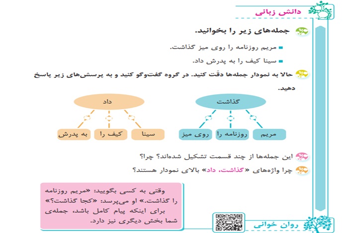 این جمله‌ها از دو قسمت اصلی تشکیل شده‌اند؛ فاعل (مانند مریم، سینا) و فعل به همراه مفعول و قید مکان (مانند روزنامه را روی میز گذاشت / کیف را به پدرش داد).